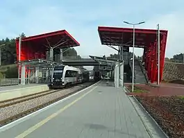 The PKM has 11 stations and stops along the route, the twelfth is being built and due to open in 2023.[5] The company also owns and operates further two stops, Gdynia Karwiny and Gdynia Stadion, located on the section of line 201 connecting Gdańsk Osowa and Gdynia Główna.[6] The line has only been recently electrified at the national standard of 3 kV DC, though regular service is still provided by ten DMUs that were ordered from Pesa SA of Bydgoszcz costing 114 million zł ($34 million).[7][8]
