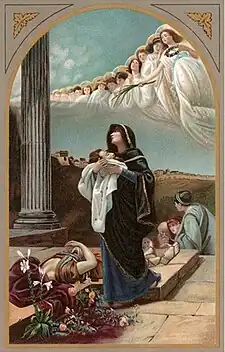 Loverini also painted some portraits, watercolors. and studies of various genres.[1][2] Among his fresco work, he painted the four biblical figures: Job, Ezekiel, Jeremiah, and Tobit, (1913) for the Chapel of Monuments in the Cimitero Unico of Bergamo.[3] In 1887 he began a cycle of frescoes depicting the Story of St Peter for the parish church of Trescore Balneario.[4] He also frescoed in the Basilica of San Pietro in Ciel d'Oro. From 1888 and in 1893, he completed five large canvases for the Sanctuary of the Madonna del Rosario of Pompei.