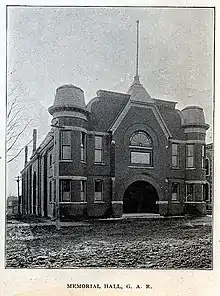 The idea of building a memorial hall was started by the Chaplain Brown Post of the Grand Army of the Republic. They held a public subscription drive to secure the funds. The county Commissioners provided a lot and additional funds. Once open in 1893, the G.A.R. held patriotic rallies, concerts, and lectures in the building, but were unable to cover the Post's debts and operating costs. In 1901 the County assumed the debts and control of the building.[6] In 1901, the building was leased to Albert F. Heineman. He provided brought in entertains for the city, including minstrel troupes, traveling theatrical companies, political figures, and vaudeville. William Jennings Bryan is said to have given his "Cross of Gold and Crown of Thorns" speech here, two years before the Chicago nominating convention in 1896, and Theodore Roosevelt appeared in 1900, while campaigning William McKinley as the vice presidential nominee.[6]