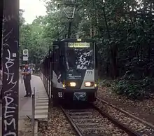 Tram line 90 of Verkehrsbetrieb Potsdam at Potsdam-Rehbrücke station (2004).