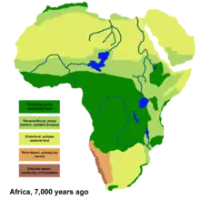 After the Bubaline Period, Kel Essuf Period, and Round Head Period of the Central Sahara, the Pastoral Period followed.[17] As cattle pastoralism had endured in the Sahara since 7500 BP, Central Saharan hunters and herders may have lived together in a common area for a long period of time.[18] Desertification may have resulted in migrations from the Central Saharan region, where the Round Head paintings are located, toward Lake Chad and the Niger Delta.[19] While some migrated south of the Sahara, other Central Saharan hunter-gatherers may have taken on the custom of pastoralism[20] (e.g., herding domesticated cattle and goats).[18] Given the opportunity to become socially distinguished, to develop food surplus, as well as to acquire and aggregate wealth, this led to the adoption of a domestic cattle pastoral economy by some Central Saharan hunter-gatherers.[21] In exchange, cultural information regarding use of vegetation (e.g., Cenchrus, Digitaria) in the Central Sahara (e.g., Uan Tabu, Uan Muhuggiag) was shared by Central Saharan hunter-gatherers with incoming Early Pastoral peoples.[21] Migration of hunter-gatherers and cattle herders out of the Central Sahara occurred as the Green Sahara underwent desertification in 4000 BP.[22] Seasonal waterways were the likely migratory route taken to the Niger River,[22] Chad Basin,[22][20] and Nile Valley.[23] Dwelling in the Sahelian region began to occur as long inhabited settlement and funerary sites of the northern region of Niger stopped being used.[22] Migration of Central Saharan peoples into the Sahelian region of Sub-Saharan Africa is verified via Saharan influenced pottery that appear in the Sahelian region.[22]
