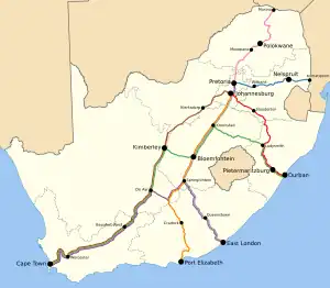 - ↑ Spoornet. "Our Routes". Shosholoza Meyl. Archived from the original on 17 February 2007.