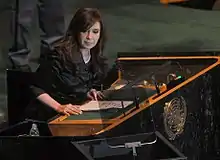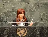 Kirchner giving a speech in the United Nations regarding the Falkland Islands.