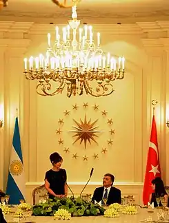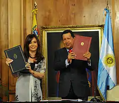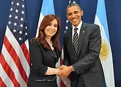 In September 2010, it was announced that Argentina was elected president of the Group of 77+China and prepared to act as a ‘bridge" with G-20 major economies to which it also belongs.[82] She visited Chile during their Bicentenary celebrations where she also assisted at the baptism of a Chilean baby, Anaís Escobar Maldonado, born in the Argentine Hospital deployed at Curico after the earthquake. The visit had a high profile in the media mainly because of the possible extradition to Chile of Sergio Apablaza. She met with president Sebastián Piñera and participated in the festivities at the national stadium.[83] She also confirmed the celebration of the III bi-national cabinet meeting for next October.[84][85] Fernández de Kirchner then departed for New York to give her United Nations General Assembly speech where she once again criticized Britain over the Falklands (Malvinas) issue, and Iran for the 1994 AMIA bombing whilst giving her support for an Israeli-Palestinian dialogue and an eventual Palestinian state.[86] On 30 September she hosted the UNASUR presidents' emergency summit at Buenos Aires due to the Ecuador crisis and started an official visit to Germany the following day in order to participate as a Guest of Honour at the Frankfurt Book Fair[87] and meet with Chancellor Angela Merkel. In October she inaugurates the III News Agencies World Congress to be held in Bariloche.[88] This same month, and as part of the 2006 civilian nuclear-power reactivation program, Fernández reopened the Pilcaniyeu uranium enrichment plant, put on ice in the 1990s, amid worsening shortages of natural gas.[89] Following the death of her spouse (see below), she also resumed activities and flew to South Korea for the G20 Seoul summit. After her return she announces that the Paris Club agrees to debt talks without the International Monetary Fund intervention as proposed by Argentina since 2008. These negotiations will result in the settlement of the last portion of the sovereign debt defaulted in the 2001 crisis after the successful restructuring debts of 2005 and 2009.[90] In November she also participated in the UNASUR Summit at Guyana after which will host the XX Ibero-American Summit at Mar del Plata.
