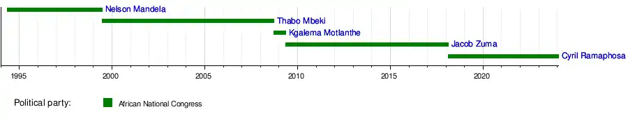 The president is elected by the National Assembly, the lower house of Parliament, and is usually the leader of the largest party, which has been the African National Congress since the first multiracial election was held on 27 April 1994. The Constitution limits the president's time in office to two five-year terms.[2] The first president to be elected under the new constitution was Nelson Mandela. The incumbent is Cyril Ramaphosa, who was elected by the National Assembly on 15 February 2018 following the resignation of Jacob Zuma.