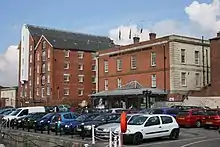 "Priday's Mill" the former city flour mills and premises of Priday Metford and Co. at Gloucester Docks. The building in the foreground is the new customs house, currently the Soldiers of Gloucestershire museum