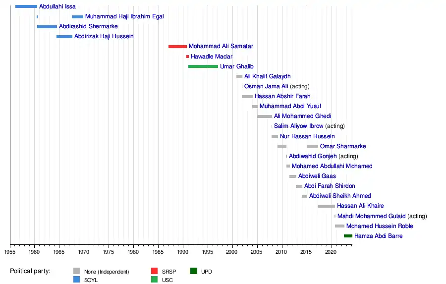 15 | Abdiweli Gaas (born 1965) | 19 June 2011 | 20 August 2012 | 1 year, 62 days | Independent | — | |