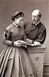 The engagement was declared on 5 December 1865, and despite the Prince of Wales's initial refusal to attend, Princess Alice intervened, and the wedding was a happy occasion.[30] The Queen allowed the ceremony to take place at Windsor Castle, albeit in the Private Chapel rather than the grander St George's Chapel on 5 July 1866. The Queen relieved her black mourning dress with a white mourning cap which draped over her back.[31] The main participants filed into the chapel to the sound of Beethoven's Triumphal March, creating a spectacle only marred by the abrupt disappearance of Prince George, Duke of Cambridge, who had a sudden gout attack. Christian filed into the chapel with his two supporters, Prince Edward of Saxe-Weimar and Prince Frederic of Schleswig-Holstein, and Helena was given away by her mother, who escorted her up the aisle with the Prince of Wales and eight bridesmaids.[32] Christian looked older than he was, and one guest commented that Helena looked as if she was marrying an aged uncle. Indeed, when he was first summoned to Britain, he assumed that the widowed Queen was inspecting him as a new husband for herself rather than as a candidate for one of her daughters.[33] The couple spent the first night of their married life at Osborne House, before honeymooning in Paris, Interlaken and Genoa.[34]