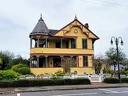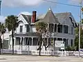 The main block of the house is gable front with a slope front gable wing on the south elevation. Exterior walls imbricated with wood fishscale shingles. Outstanding features on the main block include decorative ogee shaped bargeboard with incised scrollwork and drop pendants. The side gable contains round arched bargeboard of similar design. A conical tower at the southeast corner complements a canted, two story porch. The porch wraps the east and west elevations and is supported by small Tuscan columns with scroll brackets. The front gabled bay is canted. Three large brick chimneys with corbelled caps and hoods are located on the north and south lateral slopes of the roof and the west ridge. The house rests on a brick pier foundation. A rear porch addition does not significantly affect the integrity of the structure. In the late nineteenth century, prominent citizens built Queen Anne-style homes along the South Washington Avenue and North Indian River Avenue corridors. The Pritchard House is the last remaining Queen Anne residence on South Washington Avenue.[6]