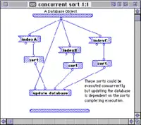 Several features of the Prograph system are evident in this picture of a database sorting operation. The upper bar shows that this method, concurrent sort