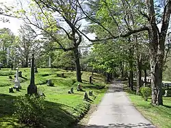 Other portions of the older section were laid out in the 19th century, when the rural cemetery movement was popular. This area features winding lanes and mature tree plantings, and is set partly in a horseshoe-shaped bowl, giving a fine vista over the terrain. Set on a promontory in this section is the grave of Charles Wesley Emerson, founder of Boston's Emerson College.[2]