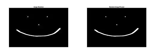 In the MATLAB example below, it takes the original image (below left) and skeletonize it 40 times then prunes the image to remove the spurs as per the MATLAB code above. As shown (below right) this removed the majority of all spurs resulting in a cleaner image.