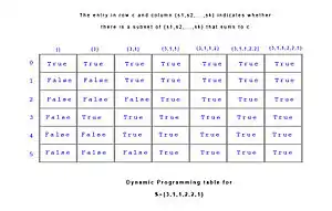 Below is the table P for the example set used above S = {3, 1, 1, 2, 2, 1}: