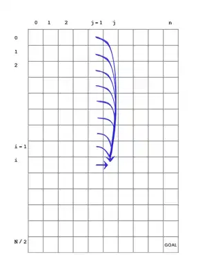 The algorithm consists of building up a table of size by containing the values of the recurrence. Remember that is the sum of all elements in . Once the entire table is filled in, we return . Below is a depiction of the table . There is a blue arrow from one block to another if the value of the target-block might depend on the value of the source-block. This dependence is a property of the recurrence relation.
