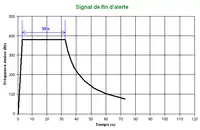 The warning signal is described by décret (by law) of March 23, 2007. It consists in a modulated sound going up and down (up to 380 Hz) during the first minute, and repeated three times. The end of alert is a continuous signal lasting 30 seconds.