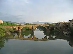 Queen Muniadona, wife of King Sancho III was the queen who gave her name to the town and the bridge, also known as the Puente Románico.[2] She built the six-arched Romanesque bridge (42°40′16″N 1°49′07″W / 42.671117°N 1.818736°W / 42.671117; -1.818736) over the Arga for the use of pilgrims on their way to Santiago de Compostela along the Camino de Santiago.[3]