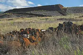 Puʻukoholā Heiau meaning "Temple on the Hill of the Whale" was the result, probably on the site of an older temple from about 1580.[4] It was built entirely by hand with no mortar, in less than a year. The red stones were transported by a human chain about 14 miles long, from Pololū Valley to the East. Construction was supervised by Kamehameha's brother Keliʻimaikaʻi, involving thousands of people.[6][7]