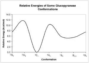 - ↑ Biarns, X.; Ardvol, A.; Planas, A.; Rovira, C.; Laio, A.; Parrinello, M. (2007). "The Conformational Free Energy Landscape of β-D-Glucopyranose. Implications for Substrate Preactivation in β-Glucoside Hydrolases". Journal of the American Chemical Society. 129 (35): 10686–10693. doi:10.1021/ja068411o. PMID 17696342.