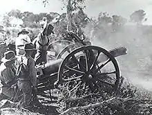 4.5-inch howitzers equipped British and Australian batteries in the Western Desert in 1940 and 1941, and Australian units in Syria.[17] Two guns that had decorated the main gate at Habbaniya aerodrome in Iraq were refurbished by the RAF and used by Habforce in the Anglo-Iraqi War in May 1941.[18] The batteries with the 4th and 5th Indian divisions went with them to East Africa and South African batteries with 4.5-inch howitzers also fought in this campaign.[19]