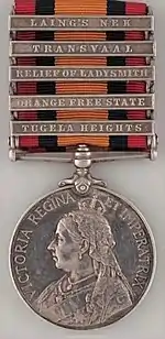 The Queen's South Africa Medal is a British campaign medal awarded to British and Colonial military personnel, and to civilians employed in an official capacity, who served in the Second Boer War in South Africa. Altogether twenty-six clasps were awarded, to indicate participation in particular actions and campaigns.[1]