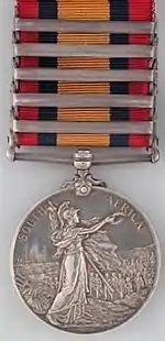 The Queen's South Africa Medal was instituted by Queen Victoria in 1900, for award to military personnel and civilian officials who served in South Africa during the Second Boer War from 11 October 1899 to 31 May 1902.[1]