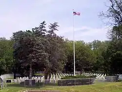 Quincy National Cemetery is a rectangular parcel surrounded by a black metal picket fence with an entrance on the west side.[2] A circular flagpole plaza is centered in the cemetery.[2] There are 24 rows running north and south.[2]