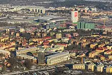Råsunda is a district in Solna Municipality, and a suburb in the Stockholm metropolitan area with around 17,500 inhabitants.[1] The movie industry set up in the area Filmstaden, formerly an ostrich farm, in 1919–1969[2] (nowadays the area has homes, offices[1]) in western Råsunda. A large football stadium (Råsunda Stadium) stood in central Råsunda 1937–2003, on the grounds of a sports field that existed from 1910.[3] Råsunda can be reached by the Näckrosen metro station (west part), Solna centrum metro and light rail station (south edge), the commuter train and light rail Solna station (east edge) and the major road Frösundaleden (south edge). The district neighbours Storskogen and Central Sundbyberg (both in Sundbyberg Municipality) to the west, Skytteholm to the south, Hagalund to the east and Järva the north.[4] The lake Råstasjön is located to the north.