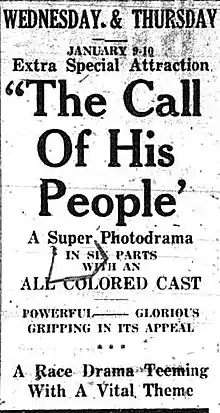 The company's The Call of His People was an adaptation of Audrey Bowser's book about passing The Man Who Would Be White.[2] Plans developed to adapt Charles W. Chesnutt's The Marrow of Tradition but did not come to fruition. The film company went out of business in 1924.