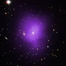 The galaxy cluster was observed for over 80 kiloseconds (~22 hours) over three Chandra X-ray Observatory observation windows, which the first two observations were in perspective by ACIS-S and the third one by ACIS-I. The glare projection was known to be done using the 2.5-7 keV and the 9.0-12 keV bands, which excluded the regions that were known to contain point sources and cluster emission.[10]