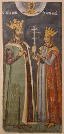 Lady Ruxandra's fate is generally unknown.[134] A woman identified as Neagoe's daughter was still attested as living Wallachia—she was spared by the new regime, being recognized as owner of Găneasa.[135] One document, issued in 1572, suggests that Ruxandra had continued to reside in Wallachia to her death.[73] The inscription on her putative grave omits her name, possibly as punishment for her alleged incest with Paisie.[29] It is also not precisely known what became of Paisie's designated heir, Marco, or of his brother Vlad. In 1554–1557, between two of Mircea's reigns, the Wallachian throne was taken by a Pătrașcu the Good, who styled himself "son of Radu Paisie". A period document suggests that Paisie had recognized his issue, personally granting Pătrașcu ownership of Segarcea.[136] One theory suggests that "Pătrașcu" was Marco's regnal name.[57] However, Paisie and Marco appear side by side in an Argeș Monastery fresco presumed to have been completed in the 1550s, on Pătrașcu's orders.[137] According to Gane, Pătrașcu was a legitimate son, born to Paisie's first wife, Stana;[138] if this is the case, then through his marriage he became a posthumous son in law of Toma of Pietroșani, his father's enemy.[139]