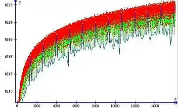 Values of |τ(n)| for n < 16,000 with a logarithmic scale. The blue line picks only the values of n that are multiples of 121.