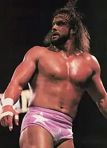 His next feud was with Ricky Steamboat, where in October, Savage crushed Steamboat's throat against a guardrail.[32][33] On March 29, 1987, Savage wrestled Steamboat at WrestleMania III in the Pontiac Silverdome. After 19 two-counts, Steamboat pinned Savage (with help from George Steele, who pushed Savage from the top rope seconds before he was pinned) to end his near 14-month reign as Intercontinental Heavyweight Champion.[34][35] The match was extremely choreographed, as opposed to the "on the fly" nature of most wrestling matches at the time; Savage was a stickler for detail, and he and Steamboat laid out and rehearsed every spot in the match prior to WrestleMania.[28] The match was named 1987's Match of the Year by both Pro Wrestling Illustrated and the Wrestling Observer. Steamboat and Savage were seen cheering with and hugging other wrestlers after the match.[3][6] The two continued to feud on house shows, including in steel cage matches.[28] During this part of his career, he became known for his stage costumes, which were created by Florida designer Michael Braun.[36]