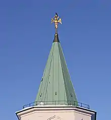 Nicholas II commissioned building of a church that became his family chapel, with outbuildings for clergy to live in and Martial Chamber, all planned in a Russian style of 17 century Yaroslavl city[8] (Russian Revival architecture), on the grounds of the Emperor's Farm Park[9] bordering Alexander Park, and the construction of the complex began in 1913 and went on until 1917-18.[8] The church was named after the Romanov royal family's patron icon Feodorovskaya Icon of the Mother of God (Our Lady of Saint Theodore), and the group of buildings ([church] campus, Rus. gorodok) after it. (Feodor is the church form and Fyodor the colloquial Russian form of the name Theodore, and Fyodorovskaya is the derivative possessive/relative adjective meaning Theodore's). The first monarch from the Romanov dynasty Michael of Russia was blessed on coronation with this icon, and the church dedication as well as the campus' 17-century Russian style were chosen to mark the 1913's tricentennial of the ruling royal house,[9] whose ascension to power signified the end of the Time of Troubles. Another church of the same name and in Old Russian style to mark the royal dynasty 300th anniversary was built as suggested by a clergyman to be built in Central Saint Petersburg next to the train station for communication with Moscow.[10]