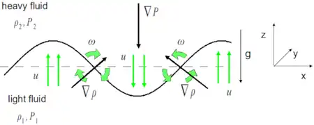 The RT instability can be seen as the result of baroclinic torque created by the misalignment of the pressure and density gradients at the perturbed interface, as described by the two-dimensional inviscid vorticity equation, , where ω is vorticity, ρ density and p is the pressure. In this case the dominant pressure gradient is hydrostatic, resulting from the acceleration.