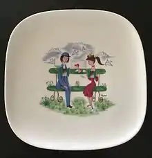 Raymond Peynet (16 November 1908 – 14 January 1999) was a French cartoonist who was born in Paris and died in Mougins (Alpes-Maritimes). He is known for having created the couple of lovers in 1942 which he represented through a variety of mediums, including ceramics, posters, jewelry, postcards, and postage stamps. In 1987, Raymond Peynet was promoted Commander of the Ordre des Arts et des Lettres.