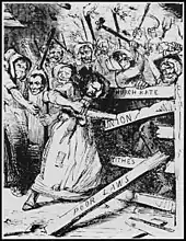 The Rebecca Riots (Welsh: Terfysgoedd Beca) took place between 1839 and 1843 in West and Mid Wales.[1] They were a series of protests undertaken by local farmers and agricultural workers in response to levels of taxation. The rioters, often men dressed as women, took their actions against toll-gates, as they were tangible representations of taxes and tolls. The rioters went by the name of 'Merched Beca' which translates directly from Welsh as Rebecca's Daughters. The riots ceased prior to 1844 due to several factors, including increased troop levels, a desire by the protestors to avoid violence, and the appearance of criminal groups using the guise of the biblical character Rebecca for their own purposes.[2] In 1844 an Act of Parliament to consolidate and amend the laws relating to turnpike trusts in Wales was passed.