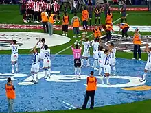 Recre narrowly avoided relegation the following season, and in 2008–09, one win in its last 15 matches led to it coming in last place and returning to Segunda after three years. Overspending in aim of returning to the top flight led to debts.[2] At the end of the 2014–15 season, the team fell into Segunda B for the first time in 18 years.[1] A year later, the club was nearing extinction due to financial problems.[6] In May 2021, due to restructuring of the Spanish football league system, the club was relegated two tiers to the fifth level for the first time in its history.[7] Journalist Damián Ortiz of the Diario de Huelva called the entire squad "bastards without honour" and "a black mark on the history of Recreativo de Huelva".[8] In April 2022, Recre achieved promoted back to fourth division. In June 2023, Recre achieved second consecutive promoted to third division after beating Cacereño in last playoff.