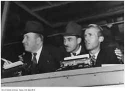 ![]() Burnett (far left) with fellow Toronto journalists Joe Perlove and Fred Jackson, c. 1930 | |
