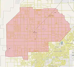 Through the early part of the 20th century, what was known as the "Redland District" – occasionally informally referred to as "the Redlands" or just "the Redland" – encompassed the communities of Homestead, Florida City, Redland, Silver Palm, Modello (now a part of Leisure City), Naranja, Princeton, and Goulds.[11] The "Redland" community included in the Redland District was the area west of S.W. 177th Avenue (Krome Avenue) to the Everglades, south to S.W. 288th Street (Biscayne Drive), and north to S.W. 184th Street (Eureka Drive).[12] The singular "Redland" was purportedly used to make it easier to differentiate the area from the city of Redlands, California.[11]