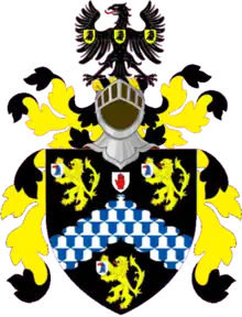 Sable a chevron invected Vair between three lions rampant Or holding between the paws an escutcheon Argent charged with an eagle’s head erased Azure.