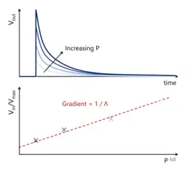 The capacitance under illumination will depend on . Semiconductors are known[19] to have a conductance, , which increases with a power-law dependence on incident optical power density: , where is a dimensionless exponent. Since is linearly proportional to charge density, and capacitance is linearly proportional to charges on the plates for a given voltage, the capacitance of a retinomorphic sensor also has a power-law dependence on . The capacitance as a function of time in response to a step function, can therefore be written as:
