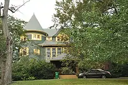 The Clark House, also known as the Rev. Francis E. Clark House, is an historic house at located at 379 Central Street in the village of Auburndale in Newton, Massachusetts. It is a 2+1⁄2-story wood-frame structure, with a cross-gable configuration that has a large circular three-story tower at the corner, topped by a conical roof. It has a variety of gables, projections, and window shapes and placement, characteristics of the Queen Anne style of architecture.[2] It was built in 1895 for Rev. Francis Edward Clark, founder of the Young People's Society of Christian Endeavour. On September 4, 1986, the house was added to the National Register of Historic Places.[1][3]