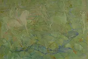 In Young Rivers (1916), perhaps Slinkard's most famous painting, he transformed the irrigation ditches of Saugus into an idyllic landscape populated by ethereal youths and animals.[3] Curiously, Young Rivers was painted in the basement of his parents' house on Wright Street in Los Angeles.[5]