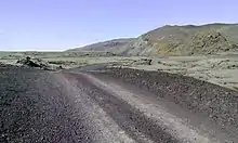 These shields are mostly circular in form, built up from pāhoehoe lavas and composed of a low-sloping lava cone surrounded by a lava apron;[1] the older shields are made from picrite, the younger, bigger ones from olivine-tholeiite. They were probably formed in long-lived eruptions (years to decades).[1] The best known edifices are Selvogsheiði [ˈsɛlˌvɔksˌheiːðɪ] (height 176 m, basal width 4.8 km, summit width 0.7 km, volume 0.64 km3), Þráinskjöldur [ˈθrauːɪnˌscœltʏr̥] (volume 5.2 km3), Heiðin há (volume 6 km3) and Sandfellshæð [ˈsantˌfɛlsˌhaiːθ] (4.5 km3).[10] Sandfellshæð is a very regularly constructed shield volcano and the largest in the southern part of Reykjanes Peninsula.[11] Another important shield volcano on Reykjanes Peninsula is Leitin, formed around 5,000 years ago.