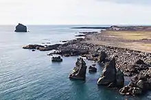 The two most important factors for the existence of Iceland, rifting in combination with the Iceland hotspot, were responsible for the existence of Reykjanesskagi.[3] Reykjanes Peninsula originated in a so-called rift jump 6-7 million years ago. At this time, the Snæfellsnes-Skagi rift had drifted so far to the west and away from the presumed steady place hot spot, that activity shifted eastwards in direction of this mantle plume which is now thought to be situated under the big glacier shield of Vatnajökull.[1] Outcropping rocks have ages from 3.2 million years to the present.[4]