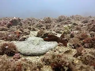 Rhodolith beds have been found throughout the world's oceans, including in the Arctic near Greenland, in waters off British Columbia, Canada, the Gulf of California, Mexico,[7] the Mediterranean [8] as off New Zealand[9] and eastern Australia.[10] Globally, rhodoliths fill an important niche in the marine ecosystem, serving as a transition habitat between rocky areas and barren, sandy areas. Rhodoliths provide a stable and three-dimensional habitat onto and into which a wide variety of species can attach, including other algae, commercial species such as clams and scallops, and true corals.[4] Rhodoliths are resilient to a variety of environmental disturbances, but can be severely impacted by harvesting of commercial species. For these reasons, rhodolith beds deserve specific actions for monitoring and conservation.[11][12][13][14] Rhodoliths come in many shapes, including laminar, branching and columnar growth forms.[15] In shallow water and high-energy environments, rhodoliths are typically mounded, thick or unbranched; branching is also rarer in deeper water, and most profuse in tropical, mid-depth waters.[1]