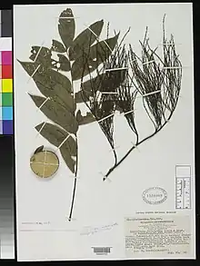 Rhoiptelea is a monotypic genus of flowering plants in the family Juglandaceae. It contains a single species, Rhoiptelea chiliantha, commonly known as the horsetail tree. This genus was previously recognized in its own family, Rhoipteleaceae, but the APG III system of 2009 placed it in the Juglandaceae family. Rhoiptelea chiliantha is native to southwest China and north Vietnam and lives at the elevation of 700-1600m in mountainous areas. The trees are wind-pollinated, the flowers arranged in large sagged panicles usually 32 cm long like horse tails, and the fruit is a small botanical nut with rounded wings. The leaves are pinnately compound and papery. The trees are usually 17 m high and with 40 cm diameter. It is a protected species of China.[1]