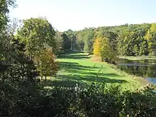 Ridgefield consists of hilly, rocky terrain, ranging from 1,060 feet (320 m) above sea level (at Pine Mountain) to 342 feet (104 m) at Branchville. Its average village elevation is 725 feet (221 m) above sea level.[7] The landscape is strewn with countless rocks deposited by glaciers, and among the town's bodies of water is Round Pond, formed in a kettle left by the last glacier 20,000 years ago. Another interesting body of water in the town is Mamanasco Lake, an 86-acre (35 ha) lake near Ridgefield High School. A particularly interesting feature is Cameron's Line, named for Eugene N. Cameron, who discovered that rocks west of the line differed greatly from those east of it. This fault line was formed some 250 million years ago by the collision of "Proto North America" and "Proto Africa", and there are still occasional light earthquakes felt along its length. The line bisects the southern half of the town, running generally north of West Lane, across the north end of the village, past the south end of Great Swamp and generally easterly into Redding in the Topstone area.[8] North of Cameron's Line, the town is rich in limestone. The mineral was extensively mined, and remnants of several limekilns exist today. Also mined here in the 19th century was mica, pegmatite, and quartz. Gold, as well as gemstones such as garnet and beryl, have been found here, and dozens of minerals have been unearthed at the old Branchville Mica Quarry. Uraninite, a source of uranium, is found here, too.