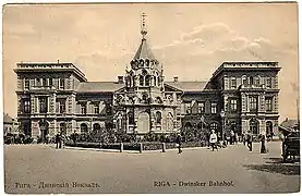 The first railway station in Riga was constructed to serve as the western terminal station of the new railway line from Riga to Daugavpils which was financed by British contractors and led by British engineers. Construction of the station started in 1858, and the ceremony of laying the foundation stone on 21 May 1858 was attended by the Governor-General of the Baltic provinces Alexander Arkadyevich Suvorov. The station opened on 12 October 1861 along with the railway line, which connected Riga with Daugavpils and the Saint Petersburg–Warsaw railway line. The station building was designed by the architect Johann Felsko, and was a small building on two floors with two platforms and four tracks. In addition to railway facilities it also housed a telegraph office, a post office and a police station.[5]