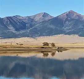 ![]() Rito Alto Peak (center) and Spread Eagle Peak (right) from DeWeese Reservoir | |